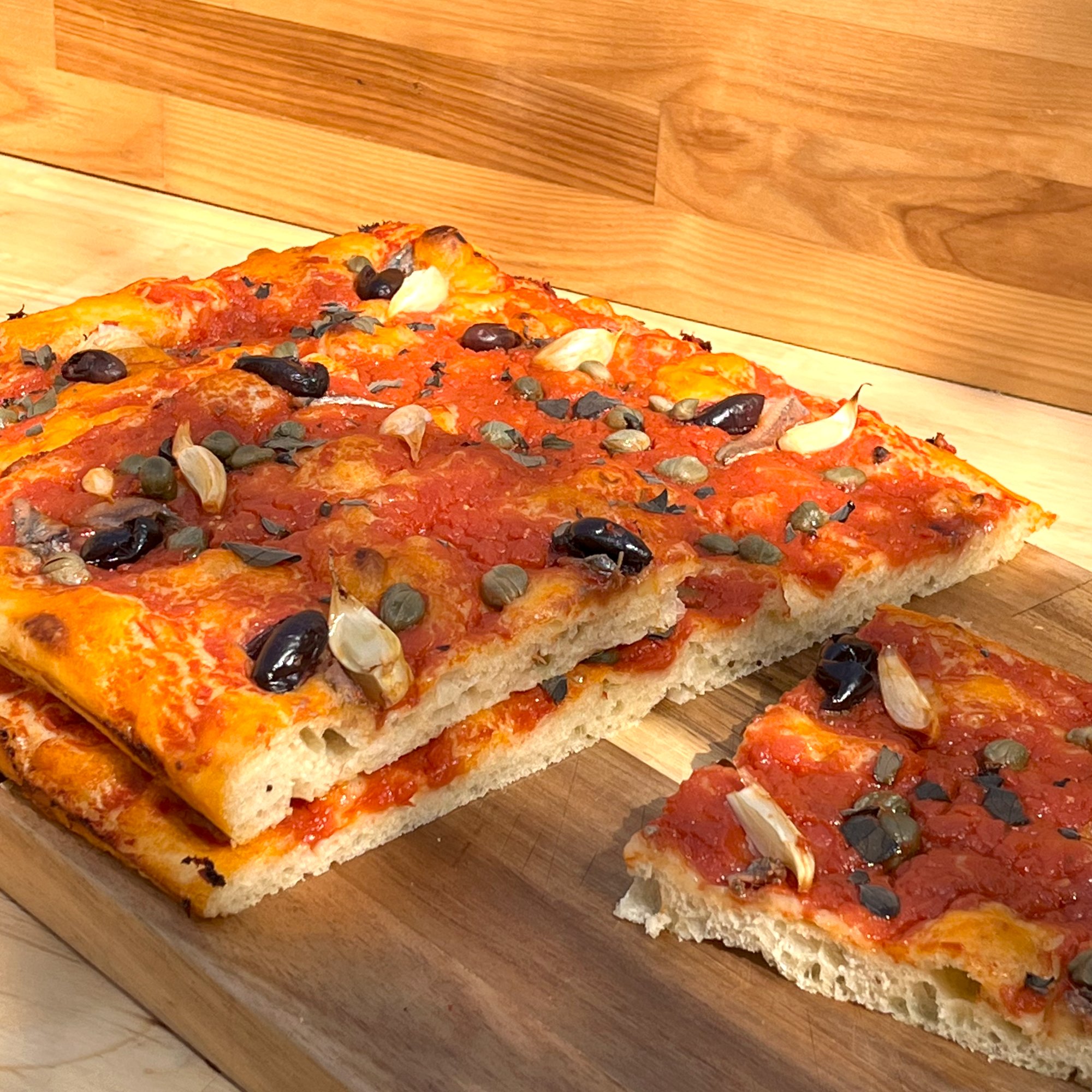 Traditionally it is topped with rich tomato sauce, capers, oregano, Taggiasca olives, salted anchovies, garlic (unpeeled) and extra-virgin olive oil.